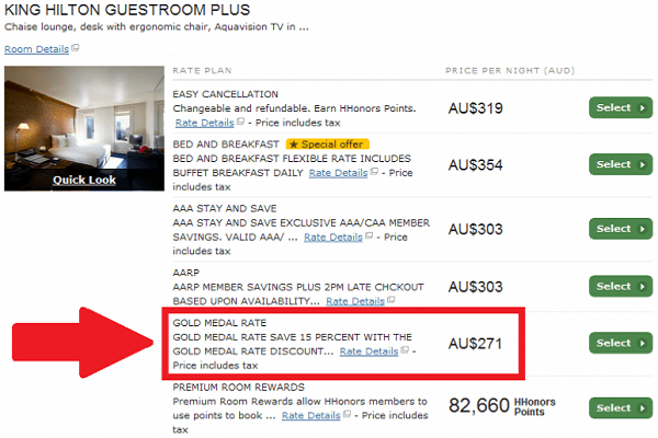 Hilton Hotel has 15% off “Gold Medal” corporate rate codes for all participating Hilton family of hotels worldwide.The “Gold Medal” rate is targeted to members and friends & family of the Team USA and seems to have the same cancellation policy as the hotel’s Easy Cancellation rate that is usually day of arrival.